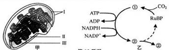6.(201407)图甲是菠菜叶肉细胞中的叶绿体亚显微结构示意图,其中Ⅰ、Ⅱ、Ⅲ表示不同的部位;图乙是光合作用的碳反应过程示意图,其中①②表示物质。请回答下列问题: