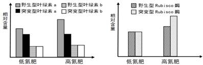 1.(2016.10)在高光强环境下,将某突变型植株与野生型植株分别施以低氮肥和高氮肥,一段时间后,测定其叶绿素和Rubisco酶(该酶催化CO2和RuBP反应)的含量,结果如图所示。