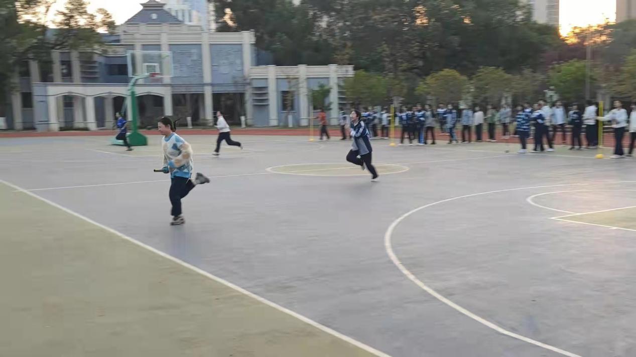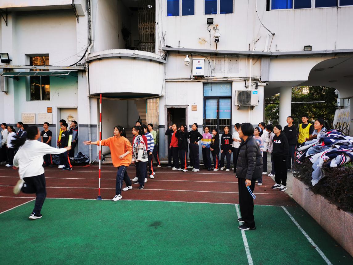 “各就各位——”,全体参赛成员整装就绪。一声哨响划破苍穹,顿声沸腾、欢呼雀跃。奔跑者手紧握接力棒,离弦般抵至终点,折回,交棒,第二位同学冲出起跑线。