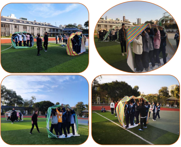 首先各班分成4个小组,每个小组5名队员。5位同学商量着谁站前面谁站后面纷纷站进了履带。