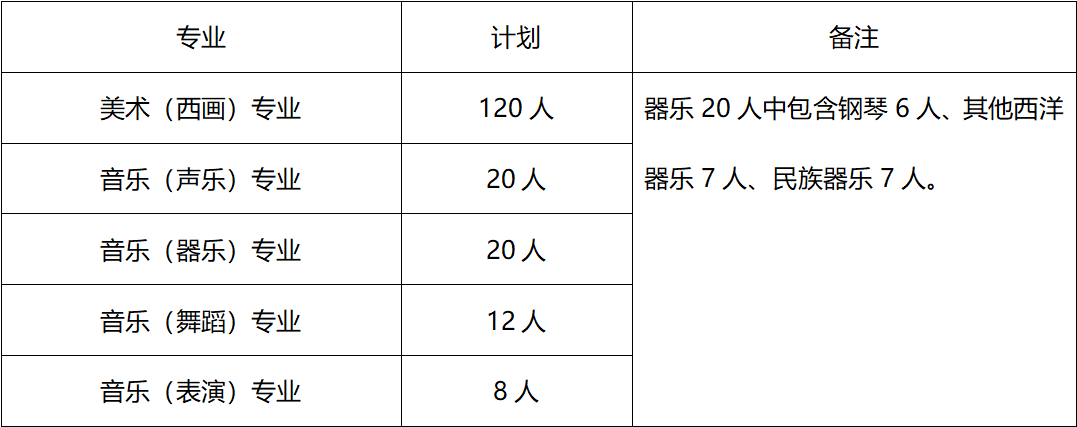 2023年面向全市(含县市区)招收艺术类普通高中高一新生共180名,包括美术(西画)、声乐、器乐、舞蹈、表演五大专业,共分6个班级,每班30人。专业计划数如下: