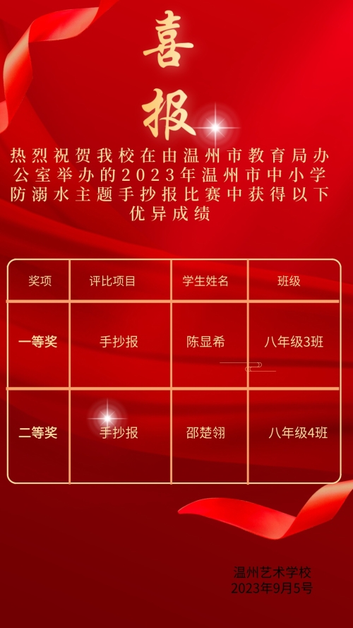 热烈祝贺我校在由温州市教育局办公室举办的2023年温州市中小学防溺水主题手抄报比赛中获得以下优异成绩