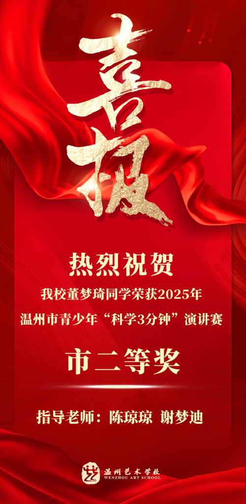 热烈祝贺我校董梦琦同学荣获2025年温州市青少年“科学3分钟”演讲赛市二等奖