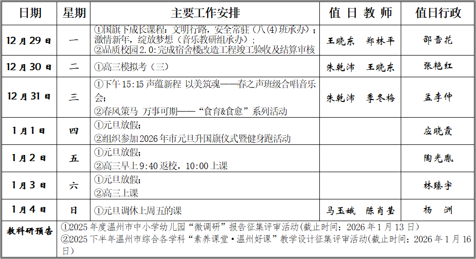 第十八周行事历(2025学年第一学期)