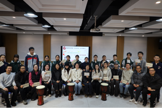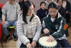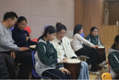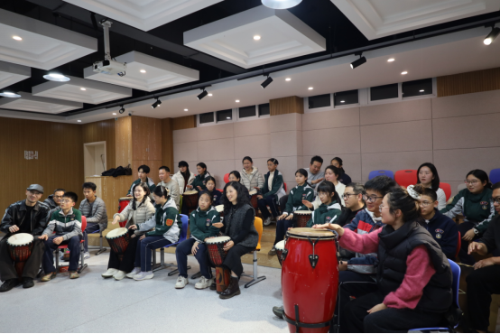 最热烈的互动聚焦于“器乐节奏-共振回响”。当非洲鼓分发到每对亲子手中,探索的节奏便此起彼伏。基础练习后,“节奏回声”和“节奏回应”游戏开始了。在即兴合作环节,家庭间的分工与合作更为默契,教室俨然成为一个流动着理解与支持的微型音乐部落。