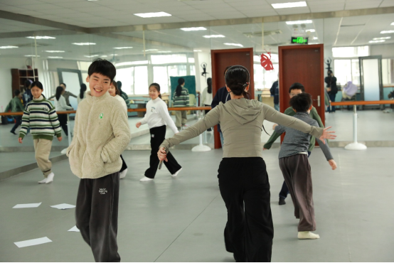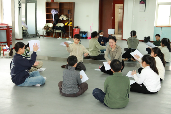 课堂初始,学生们盘坐围圈,掌心轻推气流,让象征落叶的 A4 纸悠悠飘动、传递,在“给予”与“承接”间初步搭建起团体连接的桥梁,感受那份细腻的温柔。手持纸张自由移动时,行走、蹲起、滚动、旋转等动作,让纸张在空中肆意漂浮、流动,学生们借此增强对身体感知与情绪表达的自由掌控。分组互动环节,步伐、空间移动与速度的变化,使纸张如落叶在风中接力飘舞,学生们在合作中体验信任,领悟个体与群体的和谐共生。最后,轻柔的自然风声与树叶摇曳声交织的音乐响起,学生们自由舞动,以身体演绎“落叶在风中起舞”,完成一场身心释放的仪式,在自然意象的引领下,感悟生命循环的宁静与希望,培育乐观坚韧的价值观。