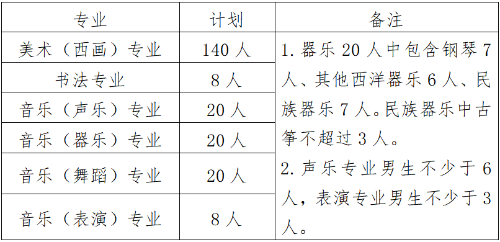 2026年面向全市(含县<市、区>)招收艺术类普通高中高一新生共216名,包括美术(西画)、书法、声乐、器乐、舞蹈、表演六大专业,共分6个班级。专业计划数如下: